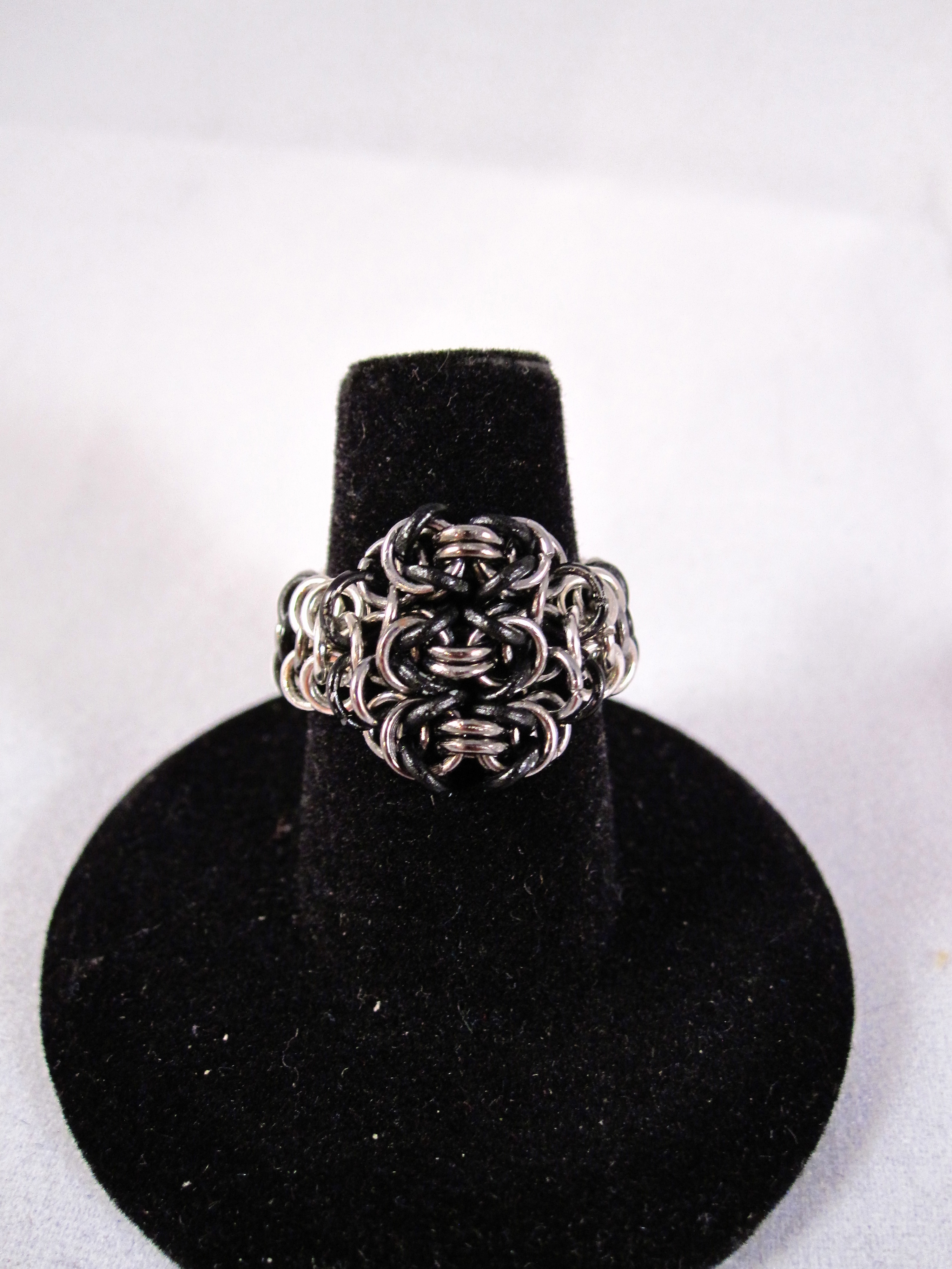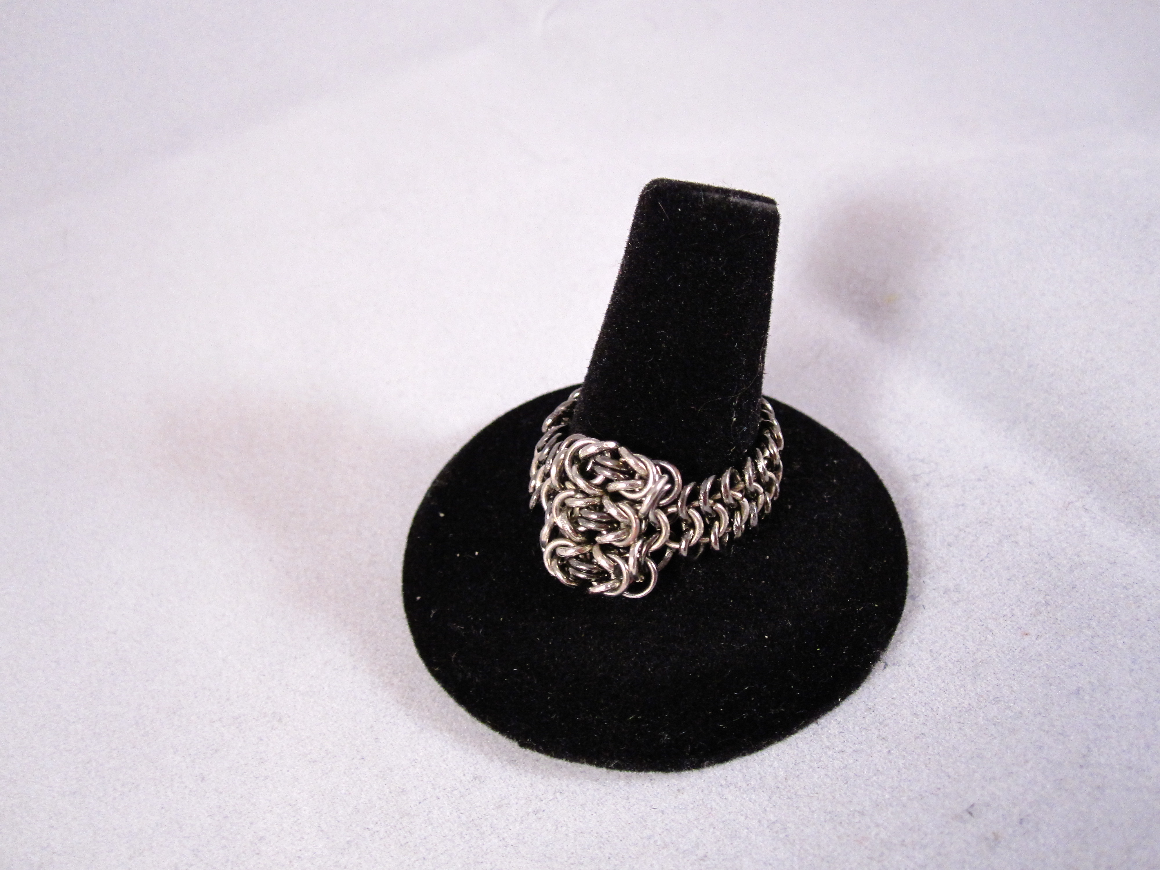 By hand-weaving almost 200 super-tiny jump rings (1-2mm diameter), this beautiful mesh ring features 3 "byzantine" chainmaille units, connected to a european 4-1 band that forms the rest of the ring.