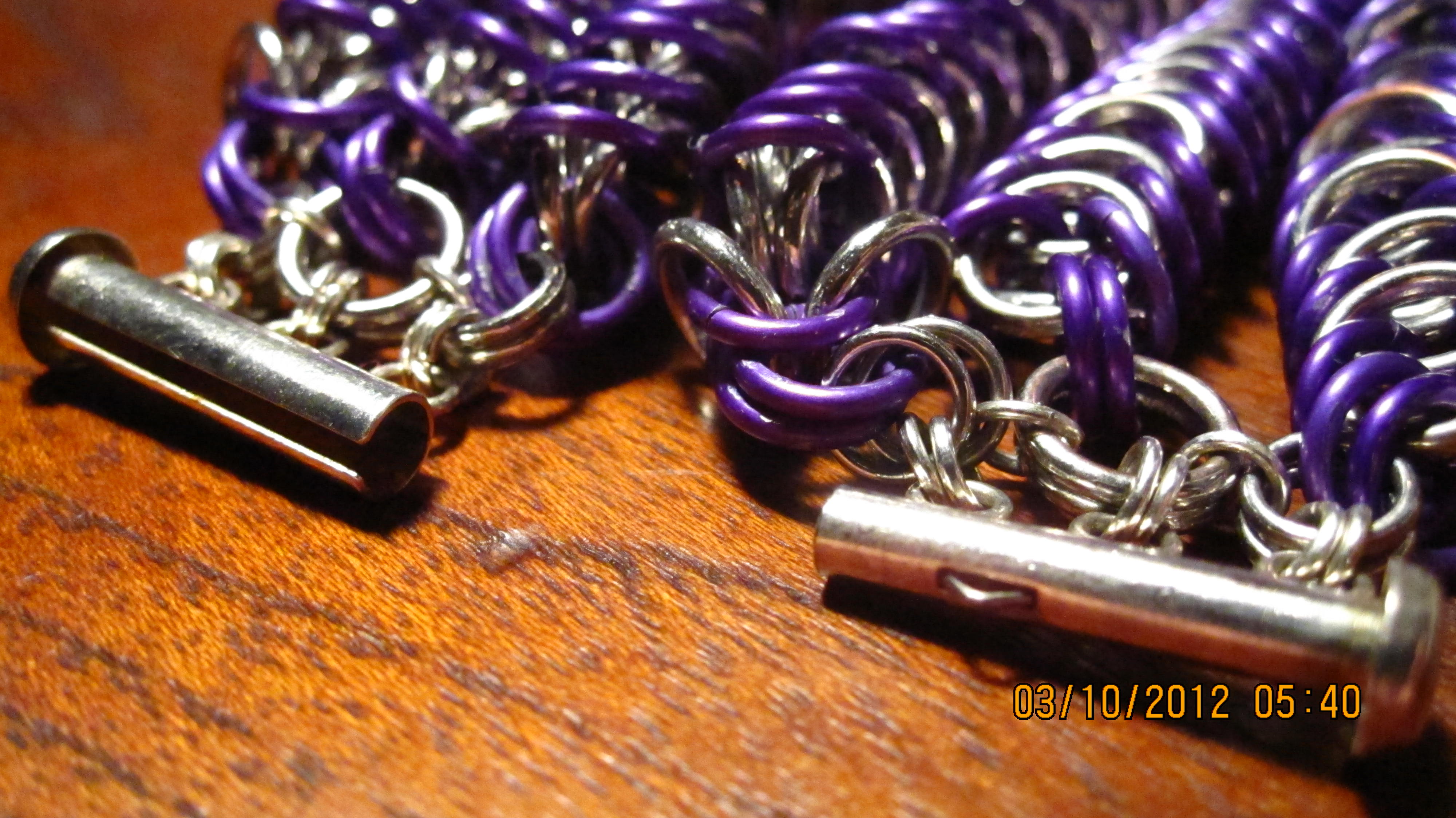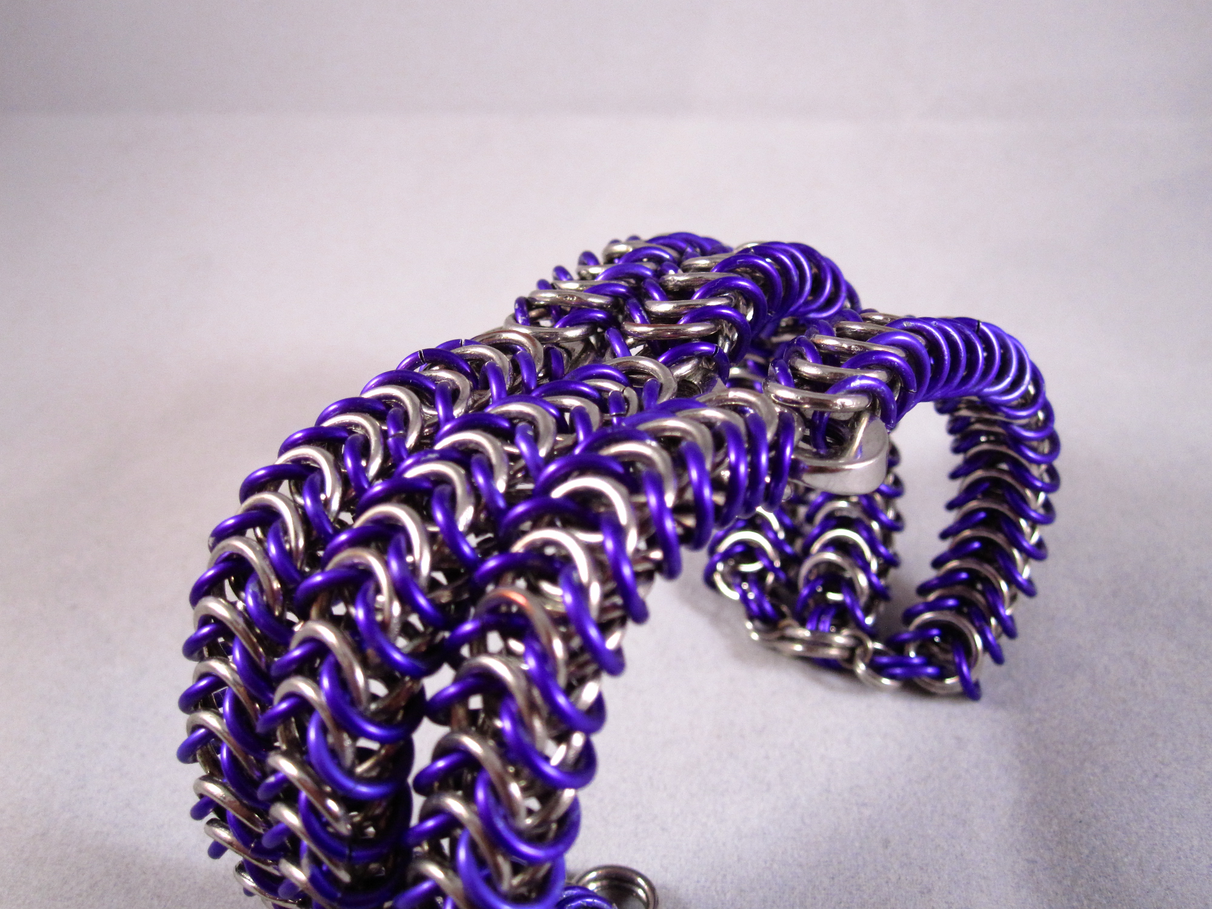3 rows of purple and silver chainmaille (box weave) extend from the center, featuring a unique design element to the cuff.* Made from almost 400 jumprings (anodized alum., plated copper. 3/16" 18ga.)