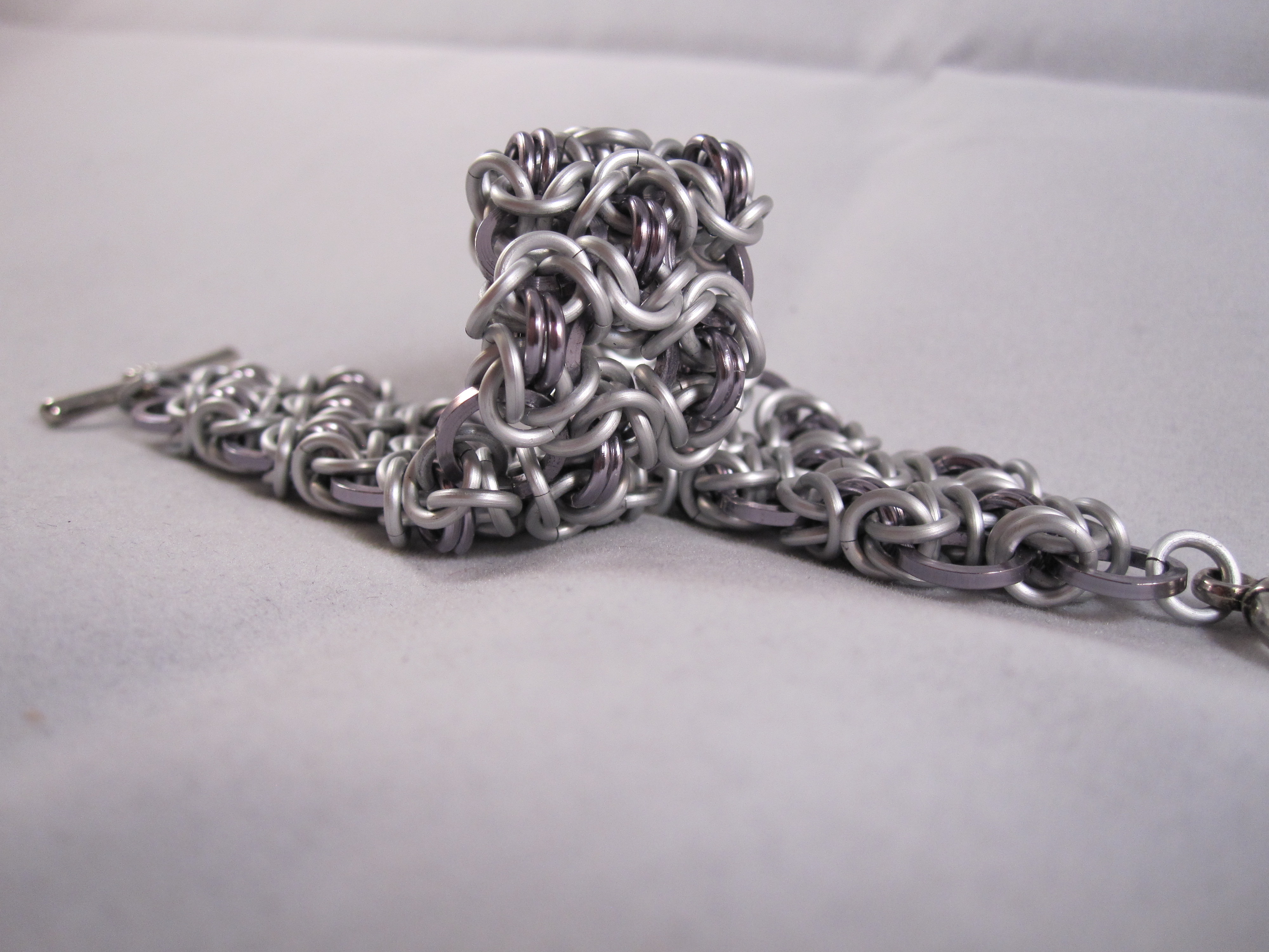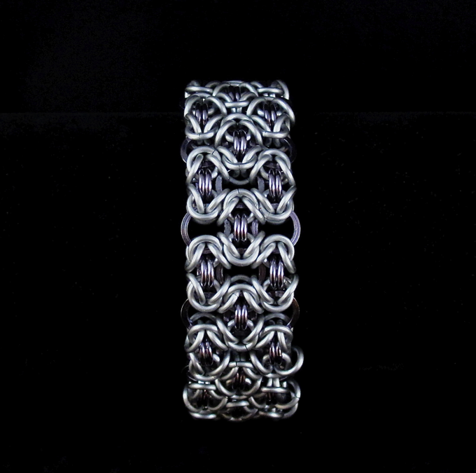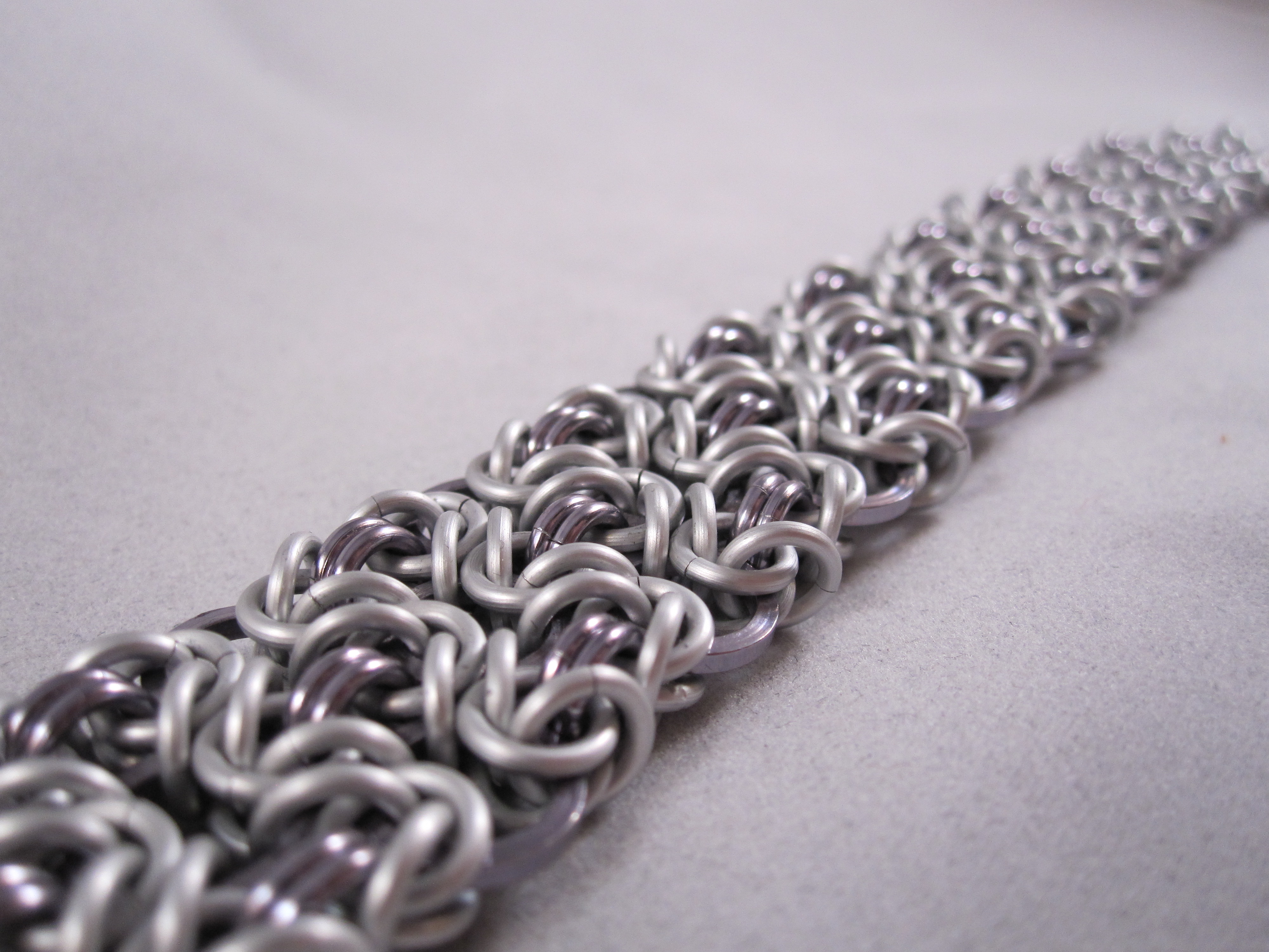 Made from over 300 rings, this striking piece displays a beautiful contrast between "white" and "black ice" anodized aluminum rings. About 30 "byzantine" units are connecting in a staggered layout, using empty or "white" space to its advantage.