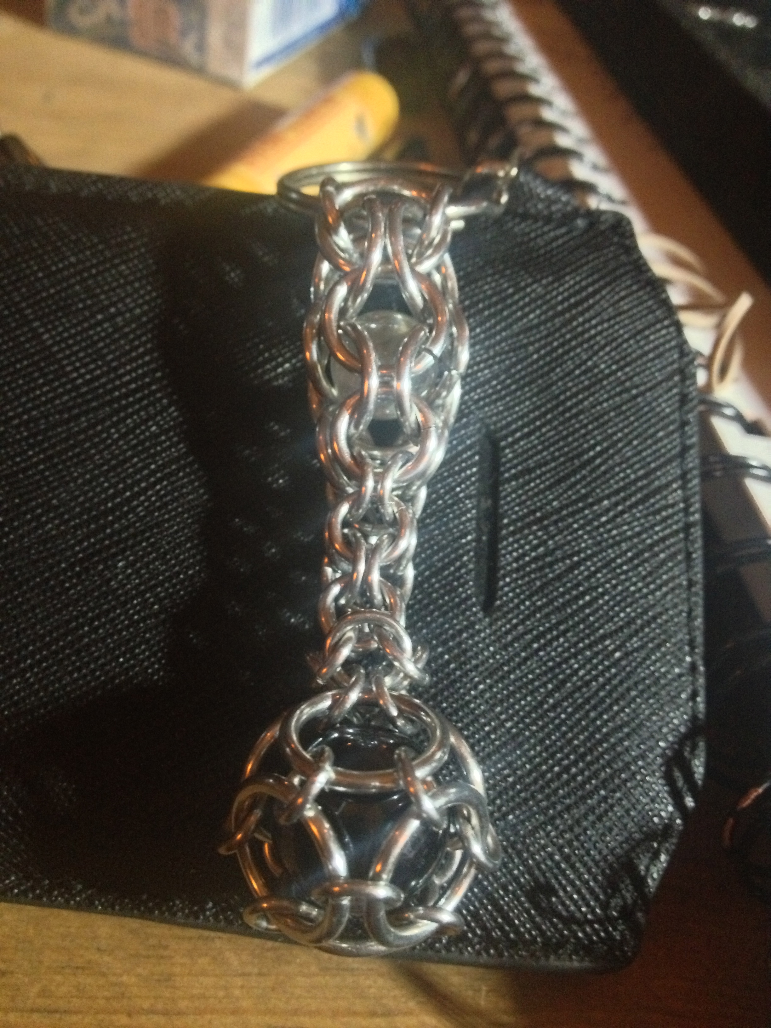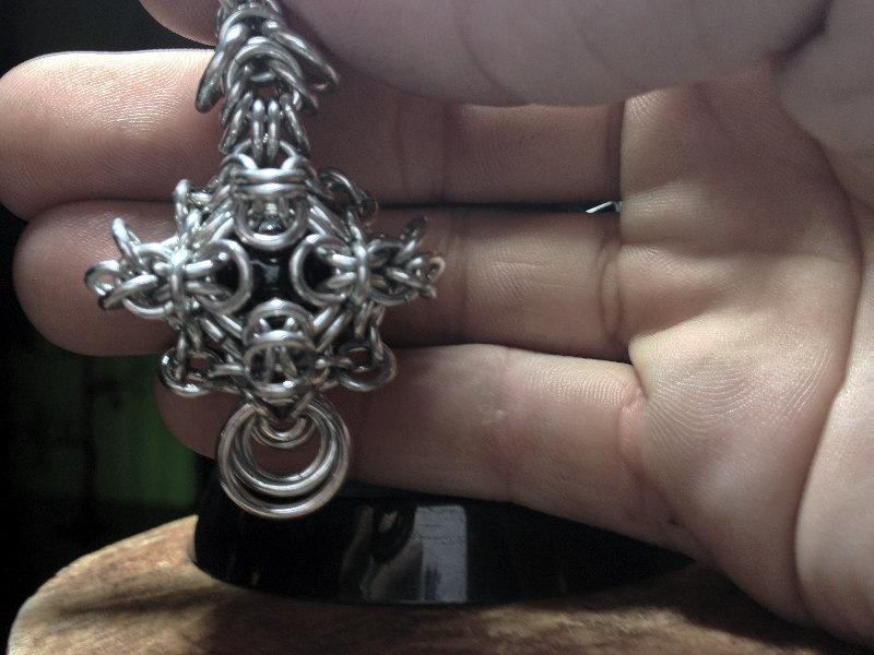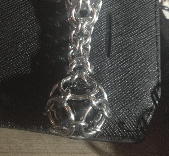 Caged within original chainmaille designs using Aluminum (BA) rings of various sizes.